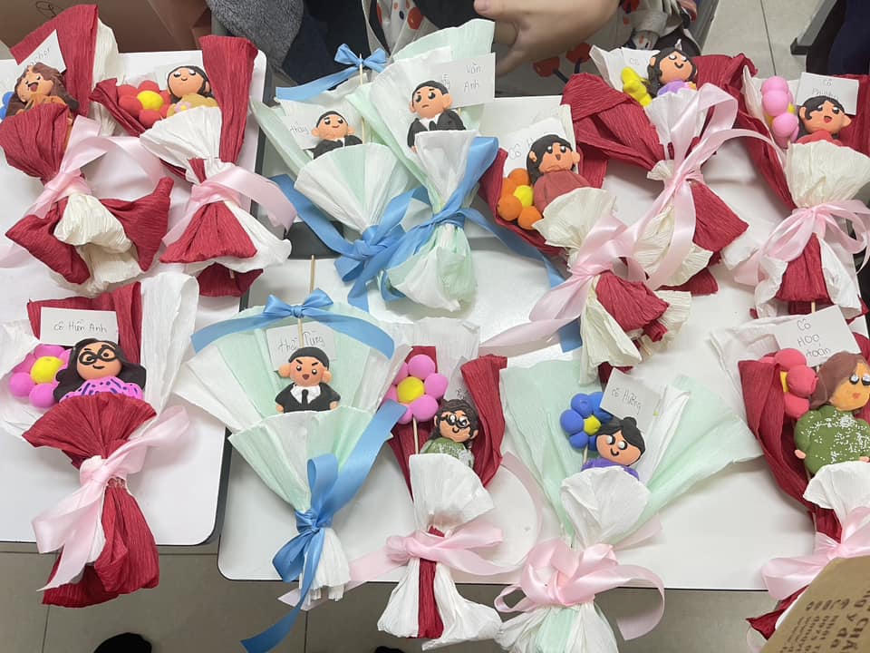 Học sinh một trường tại Hà Nội tự tay làm những bó hoa handmade gửi tặng các thầy cô giáo. Ảnh: A.N.S |