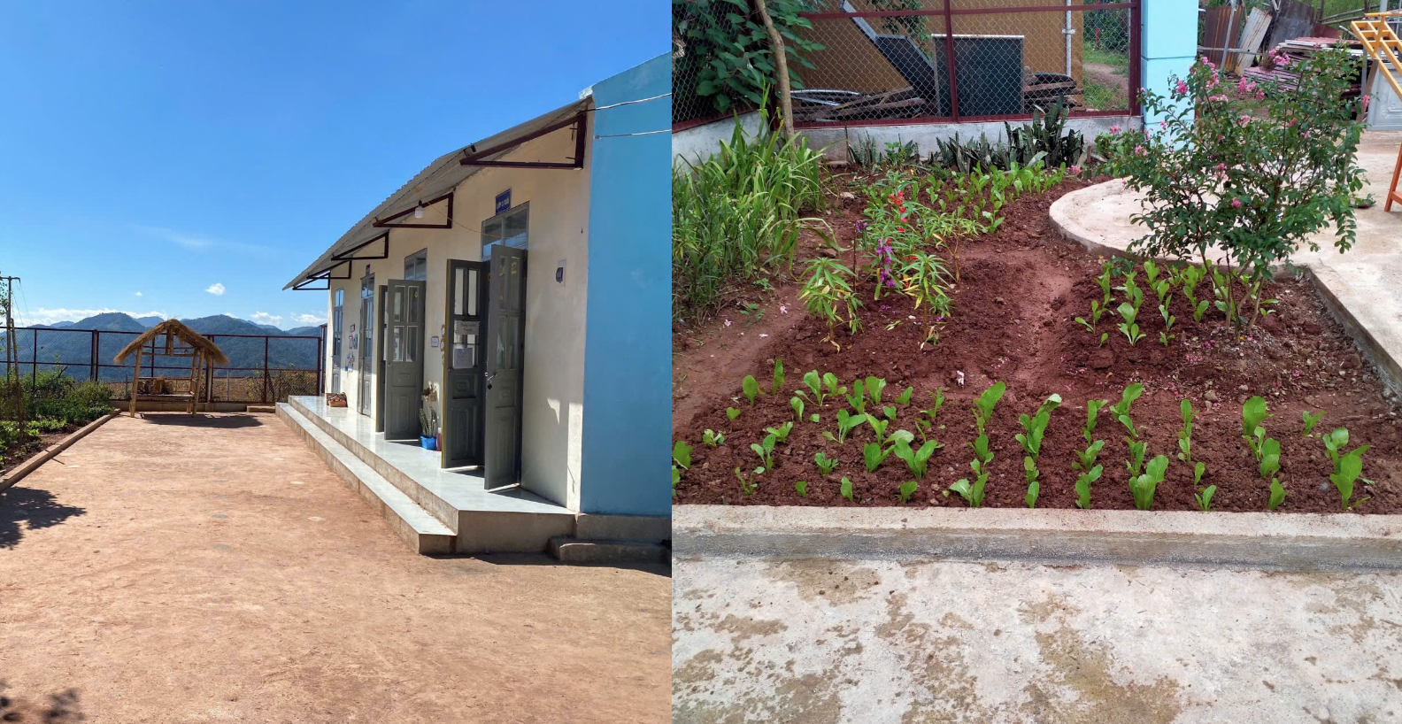 Bên cạnh đó, điểm trường còn được xây thêm khu nhà bếp, khu vệ sinh, sân chơi được đổ bê tông, bao quanh bằng hàng rào là hàng cây Hoa Ban Tím, Hoa Phong Linh, cây ăn quả và có một khu trồng rau xanh để đáp ứng tại chỗ nhu cầu rau sạch cho các em.