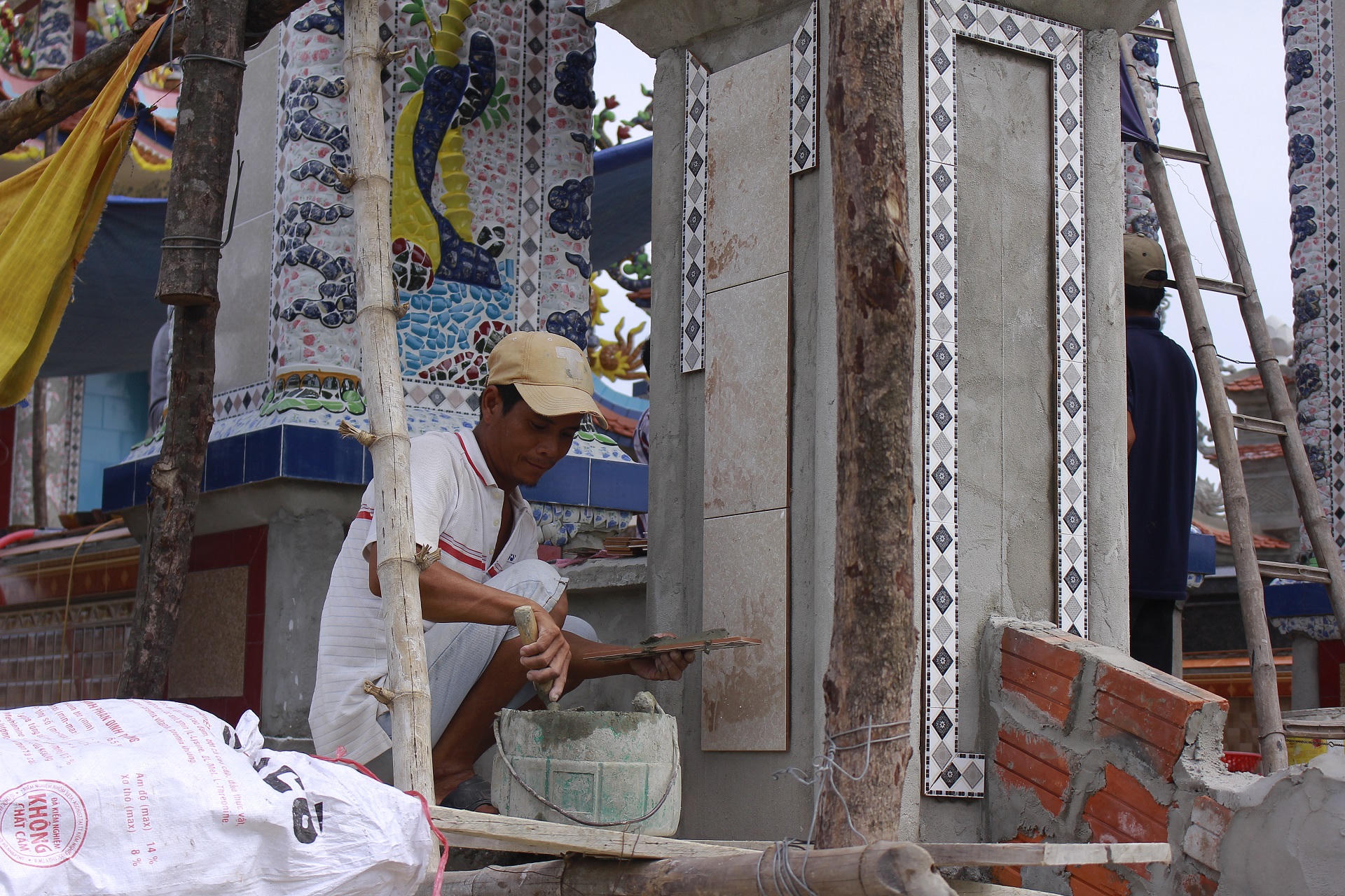 Rời khỏi cái lăng đang bắt đầu xây, tôi đi sâu vào khu nghĩa địa và may mắn bắt gặp một đội lao động khác đang tỉ mỉ gắn những hoa văn, chạm trổ Rồng, vẽ những họa tiết lên ngôi mộ đang trong quá trình hoàn thiện. Bác Đỗ Chấp (42 tuổi), cũng là một người có gần 20 năm trong nghề xây lăng mộ và là người xã Vinh Thanh cho tôi biết: “Tôi không biết sao họ lại có thể bỏ cả tỉ bạc chỉ để xây lăng mộ, tôi thấy nó phí quá. Nhưng mà không sao, nhờ vậy mà tôi đã có việc làm gần 20 năm nay, không chỉ tôi đâu, hầu hết những người thợ ở đây cho đến người chủ thầu đa phần đều là người xã Vinh Thanh”. Đặc biệt, trong nhóm của bác Chấp có một thanh niên còn khá trẻ, khi tôi hỏi đến thì mới biết cậu tên là Hồ Minh Sáu (19 tuổi), sau khi học xong 12 cậu đã xin vào nhóm và đi làm thợ phụ, tính đến giờ cũng được hơn 1 năm cậu đi làm lăng mộ.