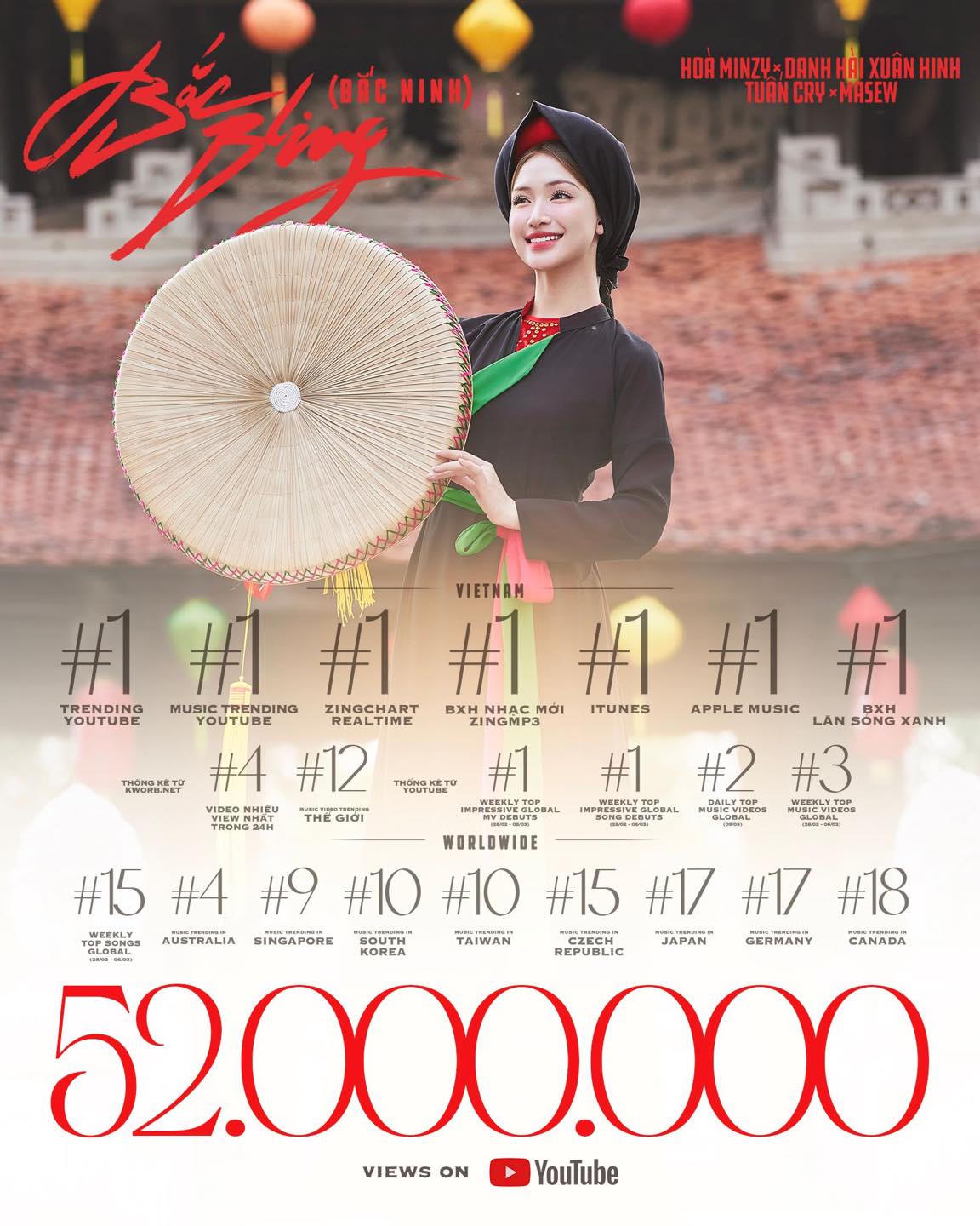 MV “Bắc Bling” của Hoà Minzy đang trở thành hiện tượng trong làng nhạc Việt Nam khi thu về gần 60 triệu lượt xem chỉ sau hai tuần ra mắt. Với giai điệu bắt tai, cách dẫn dắt hình ảnh đậm sắc văn hóa, MV này đã nhanh chóng vượt qua nhiều đối thủ đình đám trên bảng xếp hạng toàn cầu của YouTube Music.