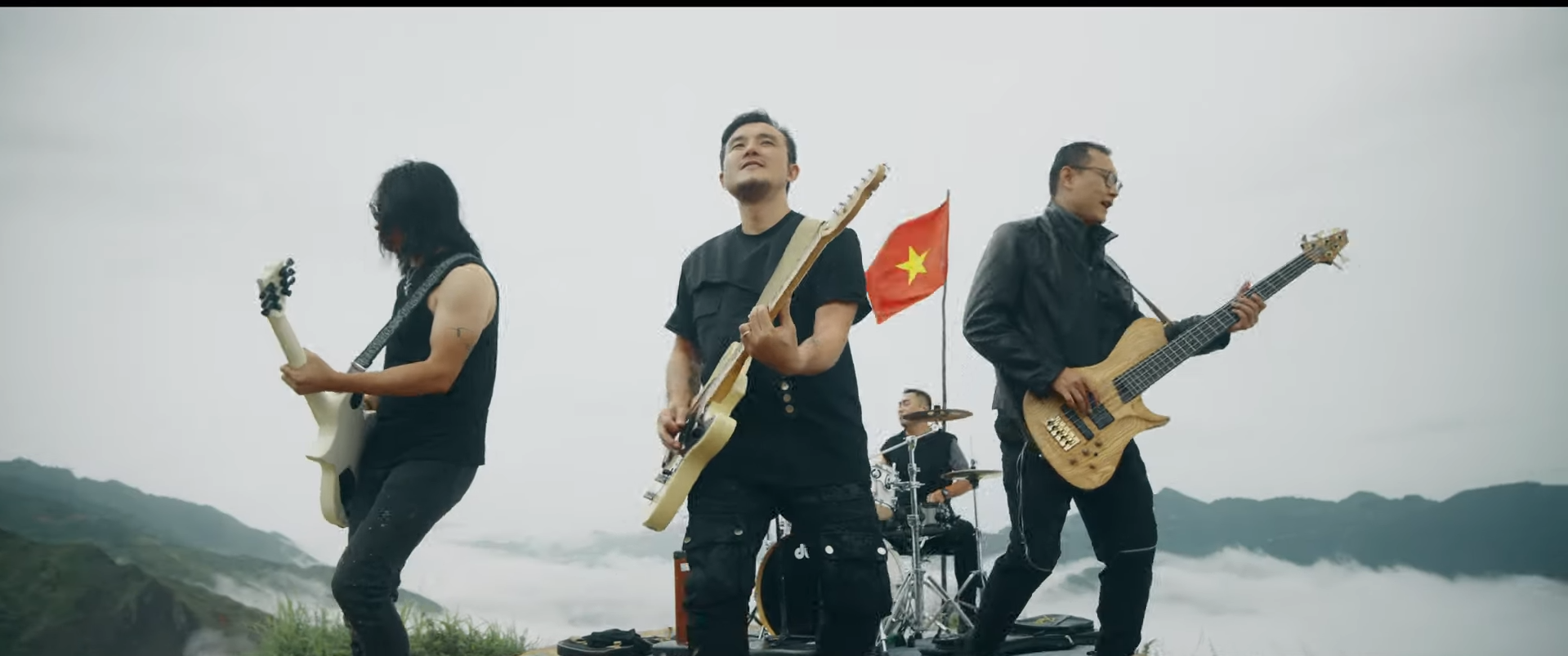 Ban nhạc Bức Tường chơi nhạc trên "sống lưng khủng long" Tà Xùa trong MV (ảnh trong MV). |