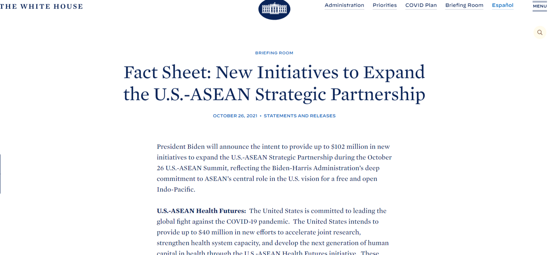 "Kế hoạch cung cấp tới 102 triệu USD cho các sáng kiến mới sẽ được Tổng thống Biden công bố nhằm mở rộng quan hệ Đối tác Chiến lược Hoa Kỳ-ASEAN trong Hội nghị Cấp cao Hoa Kỳ-ASEAN ngày 26/10, phản ánh cam kết sâu sắc của Chính quyền ông Biden- bà Harris đối với vai trò trung tâm của ASEAN trong tầm nhìn của Hoa Kỳ về một Ấn Độ Dương - Thái Bình Dương tự do và cởi mở", tài liệu của Nhà Trắng khẳng định.