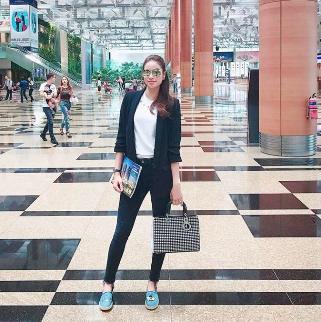 Phạm Hương là tín đồ của phong cách tối giản khi phối layer blazer đen với áo phông, quần jeans đậm dấu ấn minimalist. Phụ kiện chấm phá cho bộ cánh của Hoa hậu Hoàn vũ Việt Nam 2015, ngoài túi xách Dior tuyệt đẹp còn là đôi giày đế cói màu xanh tươi mát, in họa tiết dễ thương.