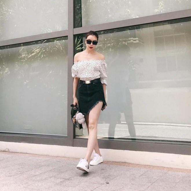 Ghép đôi áo trễ vai và chân váy denim xẻ hông, Trà Ngọc Hằng thành công phô diễn ''điểm vàng'' cơ thể.