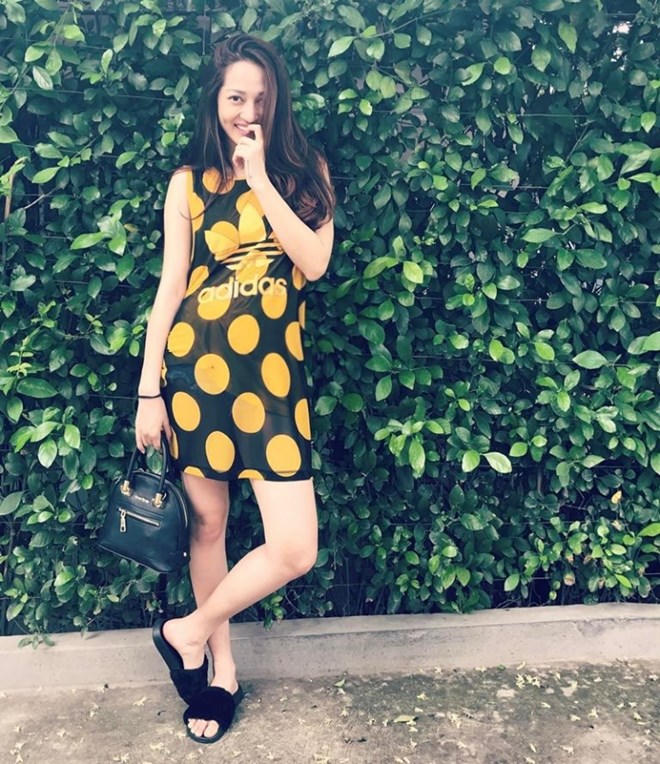 Chọn áo phông sát nách in hình độc đáo, Hoàng Thùy Linh đã đem đến nét “phá cách” trẻ trung cho cặp đôi quần jeans, giày cao gót nữ tính. Giọng ca ''Bánh trôi nước'' dùng thắt lưng Gucci tạo điểm nhấn và ''thắp sáng'' tổng thể bằng túi xách Chanel tông màu sáng.