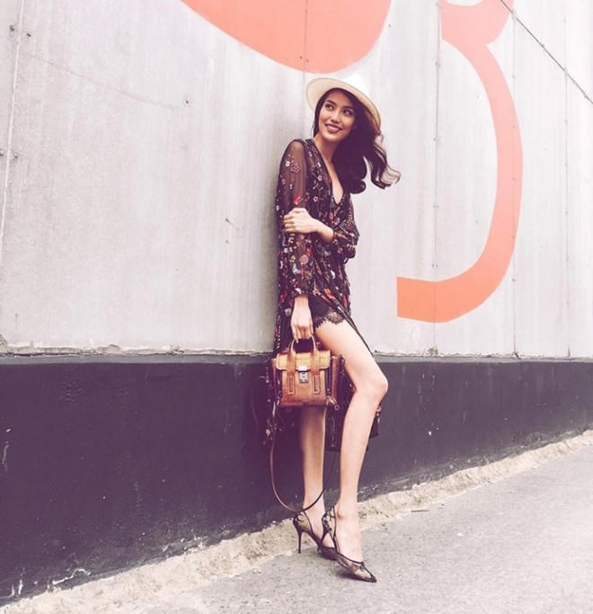 Lan Khuê khoe dáng nuột nà trong thiết kế đầm đen trễ nải, kết hợp cardigan hoa nhí vải sheer. Quý cô xinh đẹp càng gợi cảm hơn khi phối đồ cùng giày cao gót ren, mang túi Phillip Lim và đội mũ vành tròn điệu đà.
