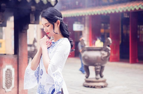 MC, diễn viên Quỳnh Chi đi chùa đầu năm mới với bộ áo dài truyền thống được cách điệu ở phần tay áo.