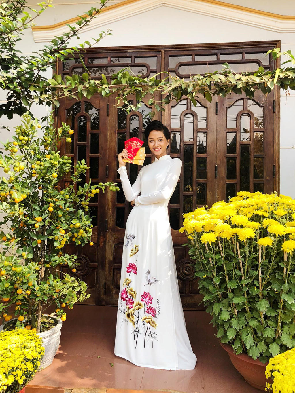 Về quê nhà đón Tết, Hoa hậu Hoàn vũ Việt Nam H'Hen Niê chọn áo dài trắng truyền thống với kiểu dáng đơn giản nhưng vẫn nổi bật với hoạ tiết thêu hoa ở phần đuôi áo.