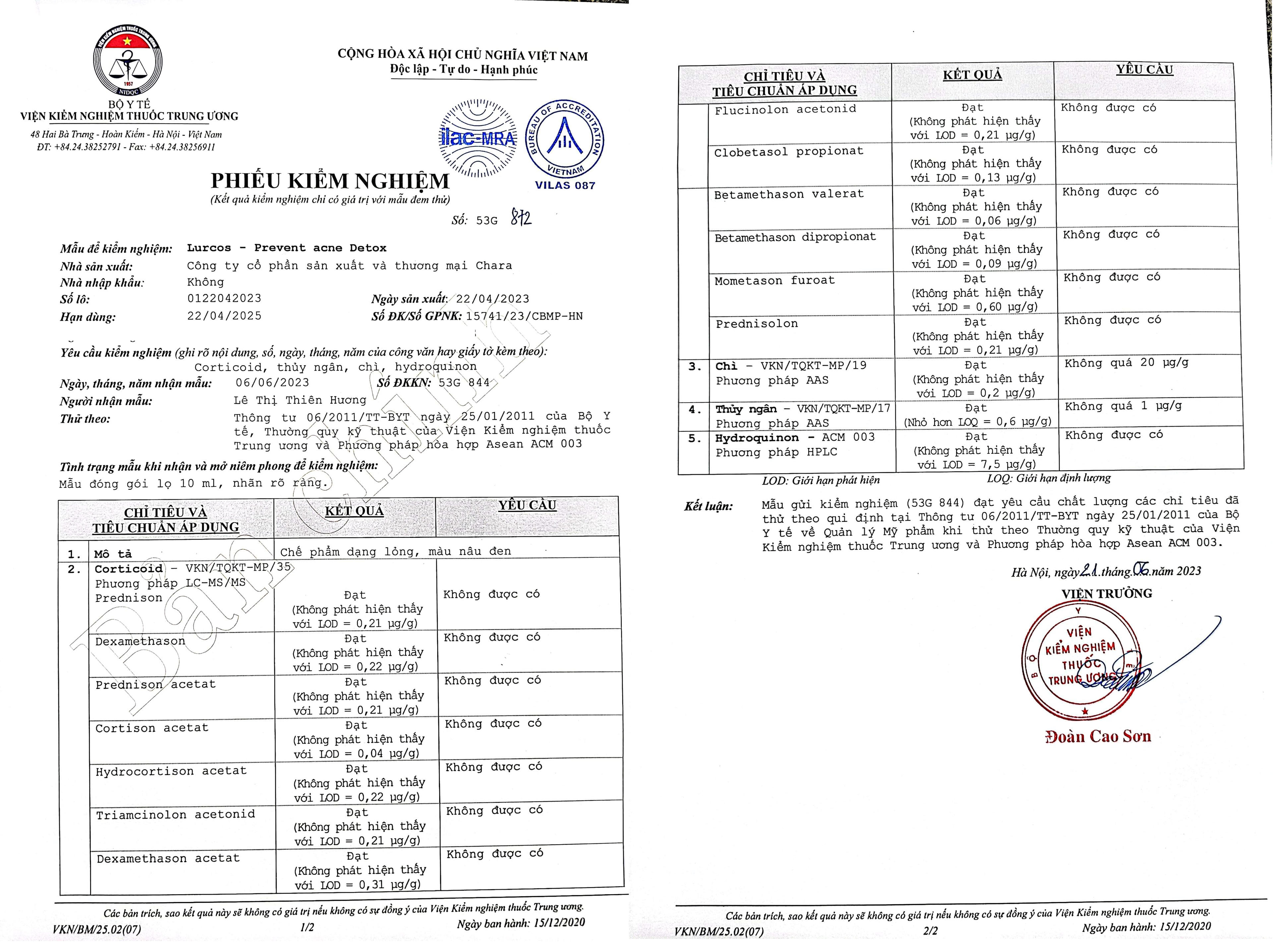 Dựa trên kết quả phân tích của Viện Kiểm nghiệm thuốc Trung ương ngày 21/6/2023 nêu rõ: 2 mẫu Lurcinn Meladi Professional; Lurcos Prevent Acne Detox đạt yêu cầu chất lượng, không phát hiện thành phần các chất cấm gây hại thuộc nhóm chất Corticoid và cũng không chứa thành phần chất cấm Hydroquino. Nhấn mạnh thêm các chất thuộc nhóm chất Corticoid là một loại chất cấm thường có trong các mỹ phẩm trị nám, mụn nhanh nhưng gây hại đến sức khỏe của người dùng. Đây là chất thường hay có trong những sản phẩm trị nám, mụn kém chất lượng, không đạt đầy đủ tiêu chí lưu hành trên thị trường.