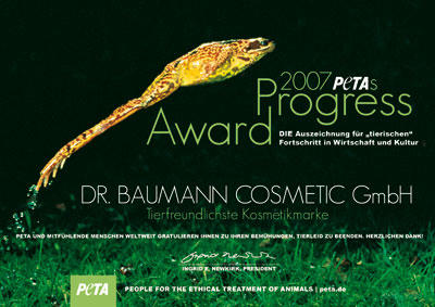 Vào năm 2007, Dr. Baumann nhận giải thưởng "Most animal-friendly cosmetics brand" do chính Peta trao tặng. Đây là thành quả của quá trình bảo vệ động vật và môi trường hãng.
