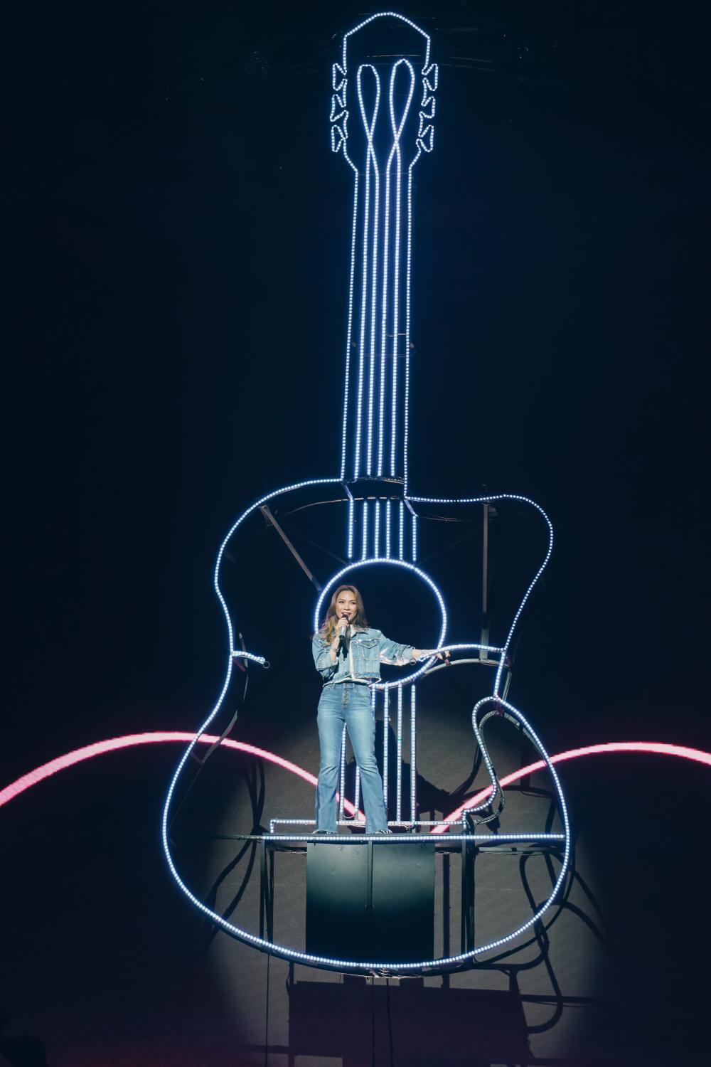 Nữ ca sĩ dựng sân khấu với chiếc đàn guitar.