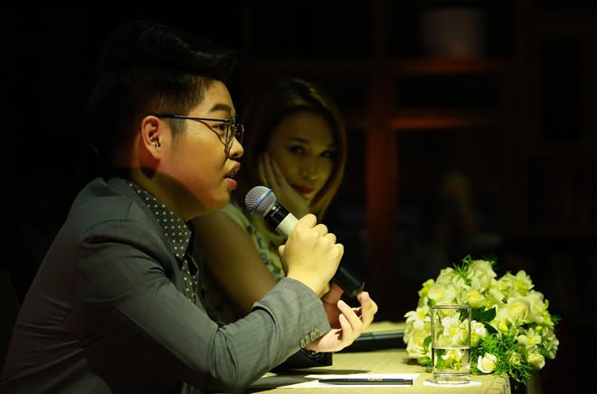 Đức Phúc trong ngày họp báo sản phẩm đầu tay, được thực hiện dưới sự hỗ trợ của huấn luyện viên Mỹ Tâm.