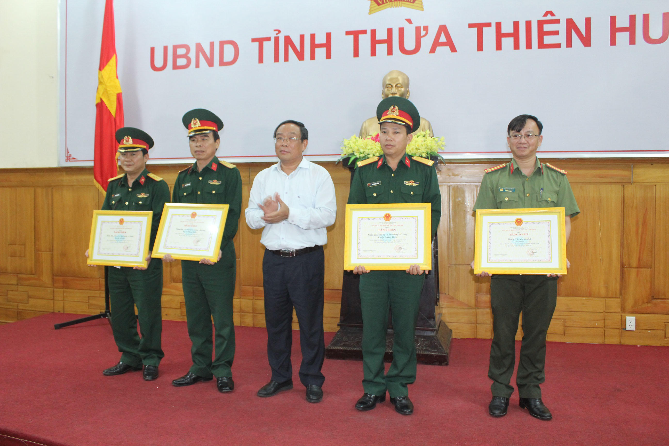 Ông Nguyễn Văn Cao, Phó bí thư Tỉnh ủy, Chủ tịch UBND tỉnh, Chủ tịch Hội đồng nghĩa vụ quân sự tỉnh trao bằng khen cho 4 tập thể. |