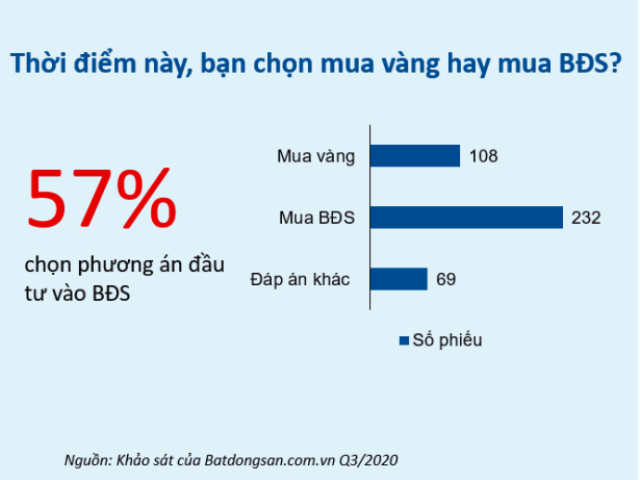 Đáng chú ý, dù đối mặt khó khăn liên tiếp nhưng khảo sát người dùng của Batdongsan.com.vn thực hiện trong quý III/2020 cho thấy BĐS vẫn là kênh đầu tư được lựa chọn nhiều nhất. Ngay cả “thời điểm vàng” liên tục tăng giá thì 57% người tìm kiếm trên Batdongsan.com.vn vẫn lựa chọn phương án đầu tư vào nhà đất.
