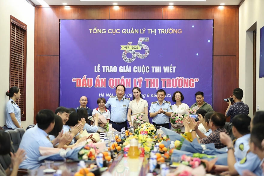 Nhà báo Hồng Tươi (dứng thứ 2 từ bên trái) tại lễ tao giải "Dấu ấn quản lý thị trường" |