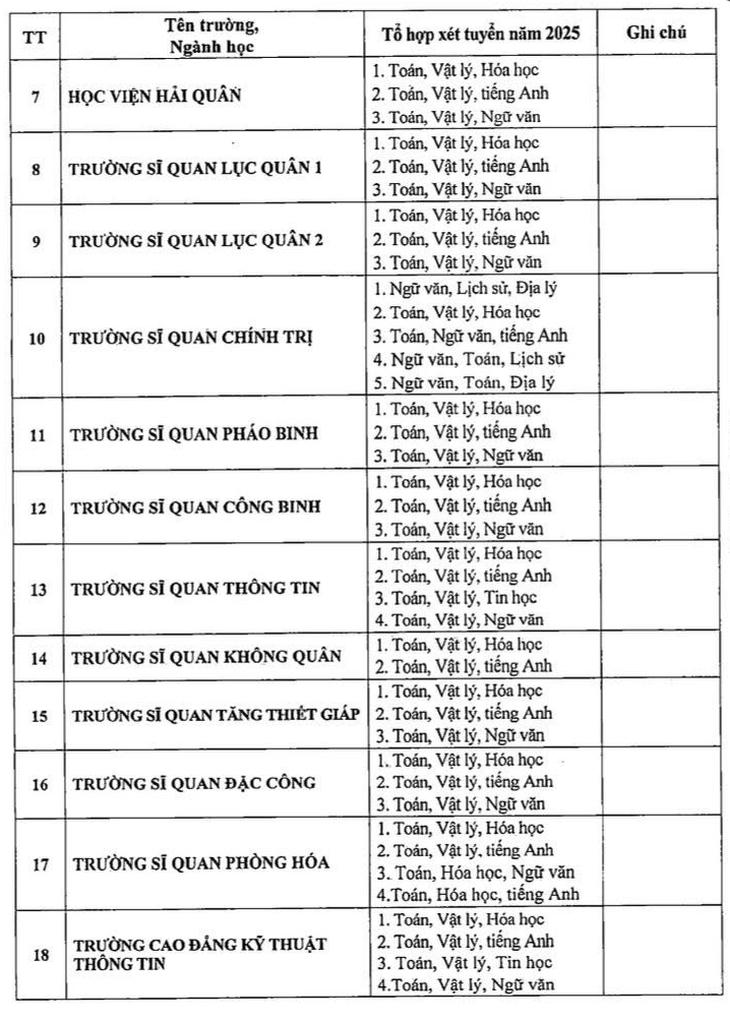 Chi tiết các tổ hợp xét tuyển vào 20 trường đại học, cao đẳng hệ quân sự chính quy năm 2025: