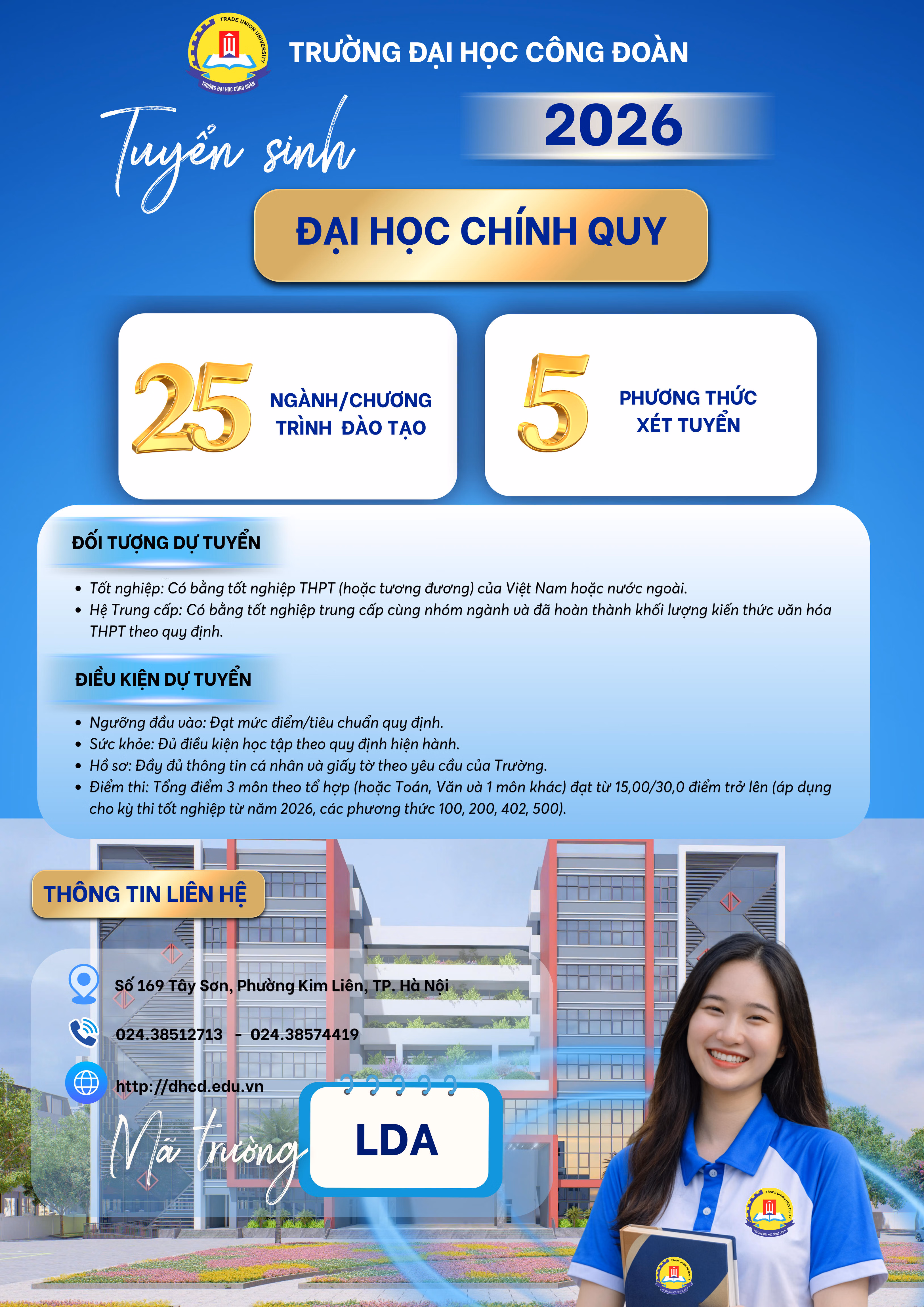 Năm 2026, Trường Đại học Công đoàn tuyển sinh 25 ngành/chương trình đào tạo và 5 phương thức xét tuyển đa dạng như xét tuyển thẳng, dựa trên kết quả thi tốt nghiệp THPT, học bạ, điểm thi đánh giá năng lực và theo đơn đặt hàng.