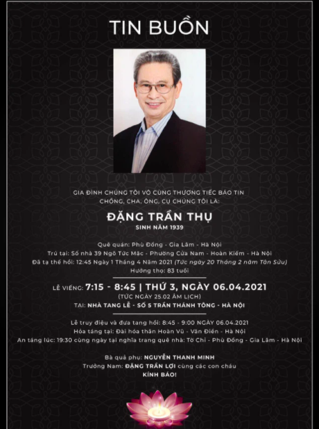 Ngày 1/4, gia đình vô cùng thương tiếc báo tin nam nghệ sĩ Đặng Trần Thụ đã qua đời vào lúc 12h45p cùng ngày. Lễ viếng sẽ được diễn ra từ 7h15 đến 8h45 ngày 6/4 tại nhà tang lễ số 5 Trần Thánh Tông, Hà Nội.