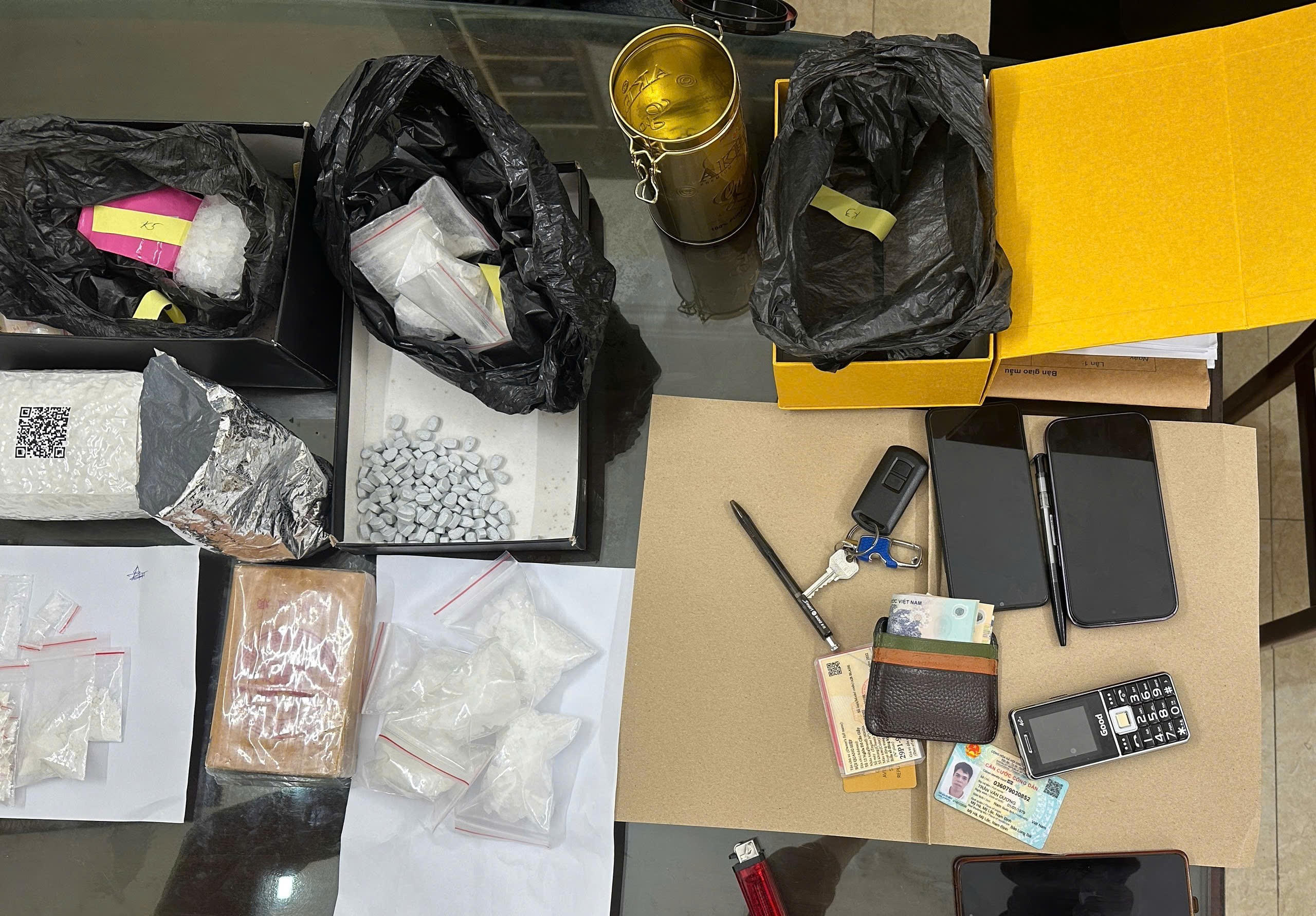Quá trình bắt và khám xét, lực lượng Công an thu giữ 1,4kg heroin, 2kg ketamine, 1 kg ma túy đá, 500 viên ma túy tổng hợp, 100 viên hồng phiến, 5 điện thoại di động cùng một số vật chứng khác có liên quan.
