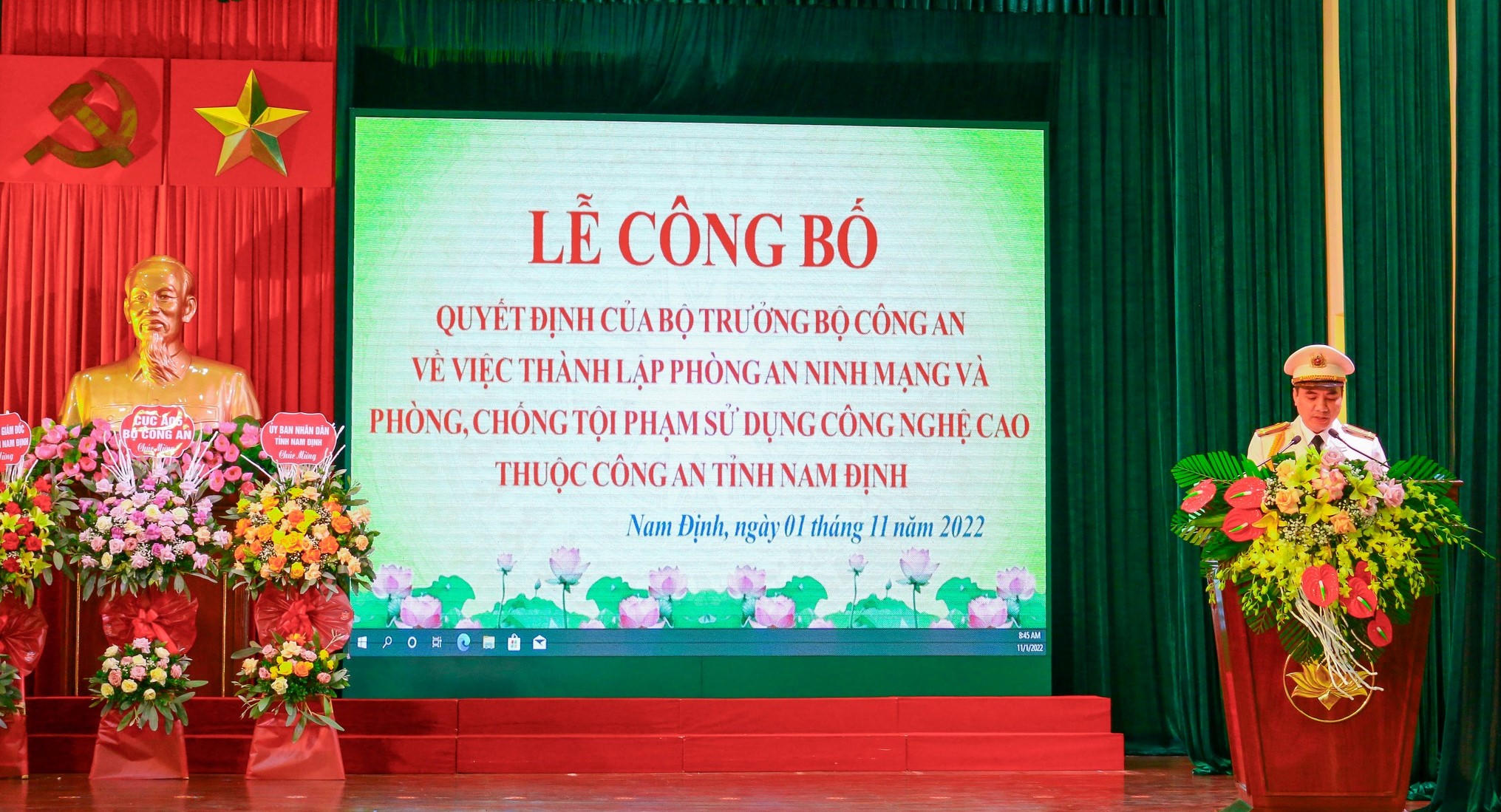 Phát biểu tại buổi lễ, Trung tá Triệu Mạnh Tùng - Phó Cục trưởng Cục An ninh mạng và phòng, chống tội phạm sử dụng công nghệ cao, Bộ Công an và Đại tá Trần Minh Tiến - Giám đốc Công an tỉnh Nam Định chỉ đạo, nhấn mạnh tính cần thiết của việc thành lập Phòng An ninh mạng và phòng, chống tội phạm sử dụng công nghệ cao Công an tỉnh Nam Định.