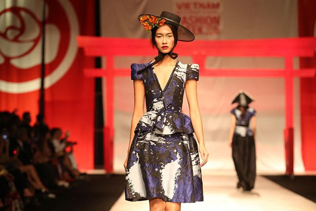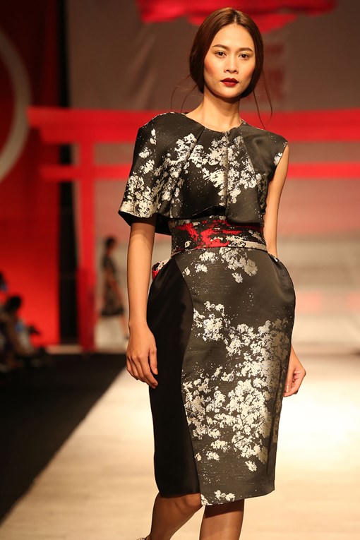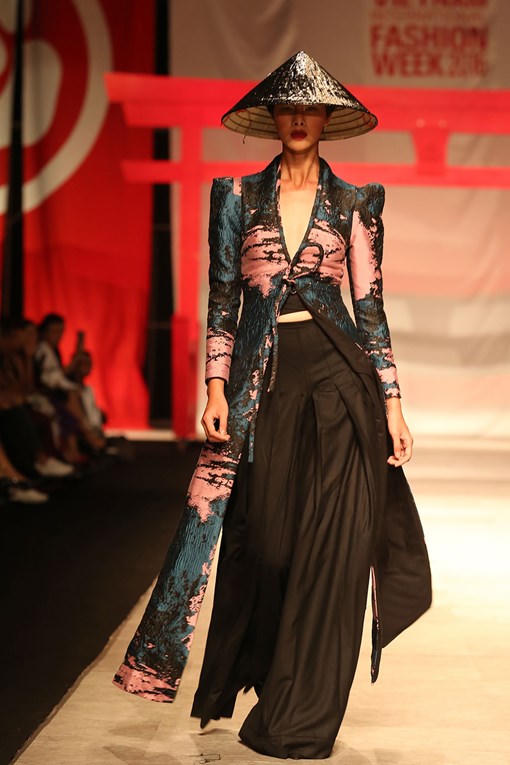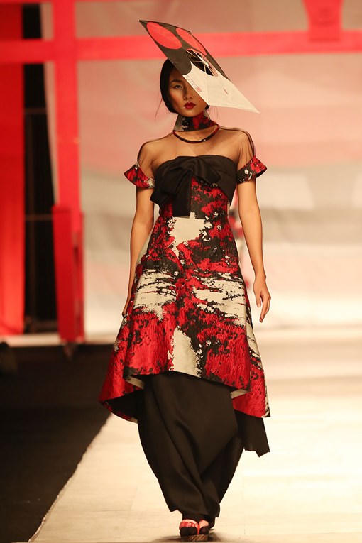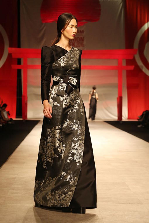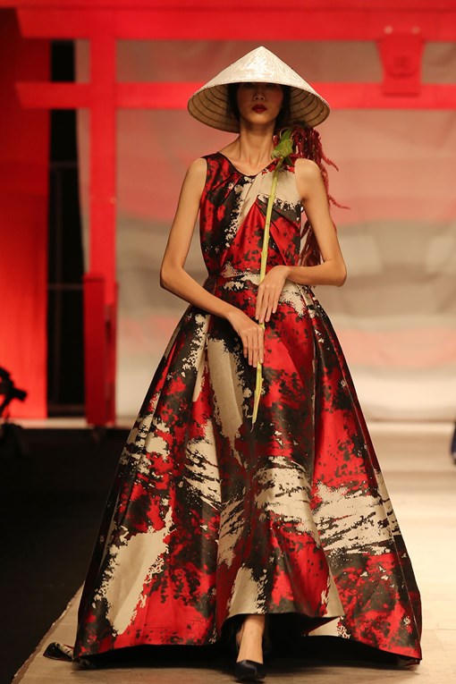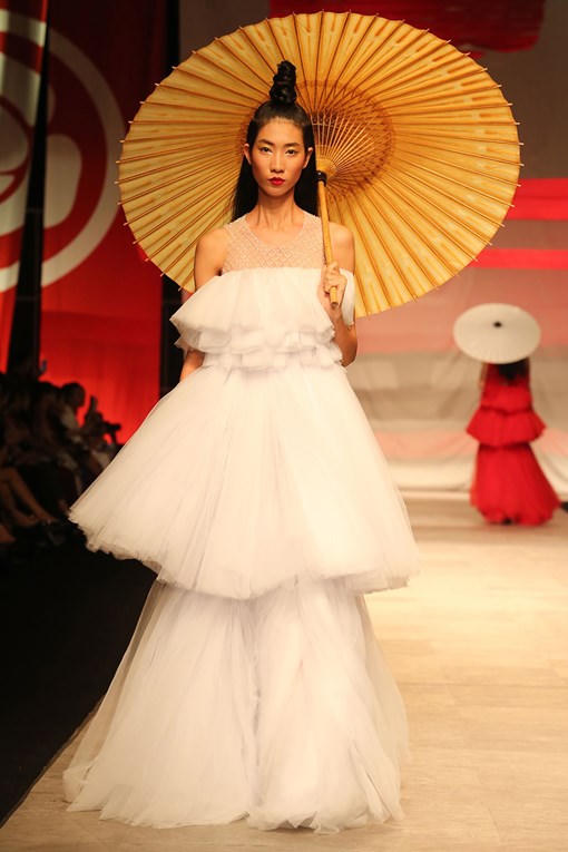 (PLO) -Nam Em diện bộ váy sang trọng, tay cầm dù với biểu cảm lạnh lùng đảm nhận vị trí vedette, mở màn bộ sưu tập (BST) của nhà thiết kế Phương My trong đêm bế mạc Tuần lễ thời trang quốc tế.