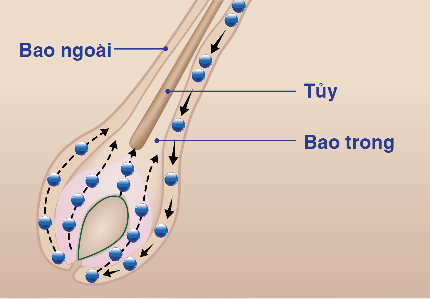 Tiến sĩ Lê Thúy Tươi giải thích: Tế bào mầm tóc nằm ở phình tóc. Đây được xem là “hạt giống” hình thành nên sợi tóc của mỗi người. Khi bắt đầu một chu kỳ mọc tóc mới, thần kinh nội tiết của cơ thể sẽ huy động một lượng tế bào mầm tóc cần thiết di chuyển xuống nhú bì – phần gốc của sợi tóc. Tại đây, thần kinh nội tiết, dinh dưỡng và một số yếu tố khác tiếp tục tác động để biệt hóa chúng thành các phần của sợi tóc hoàn chỉnh.