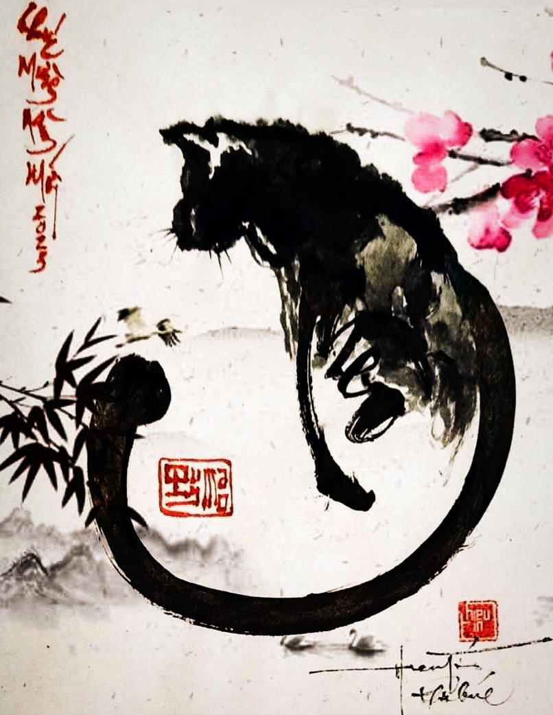 .4. Họa tự “Mèo phúc lạc”: với tư thế chú Mèo ngồi vững chải, khỏe khoắn, an lạc, ngắm nhìn dòng chữ “chúc mừng năm mới”. Đặc biệt, bằng nét bút nhanh như chớp dứt khoát, mãnh liệt ở đuôi mèo tạo nên nội lực và rất có hồn, chữ “mèo” được ẩn trong thân Mèo, trông rất huyền bí. Đây là thủ pháp thủy mặc, anh sử dụng độ loang của mực tàu, tạo nên những mảng màu sáng tối rất tự nhiên và nghệ thuật.