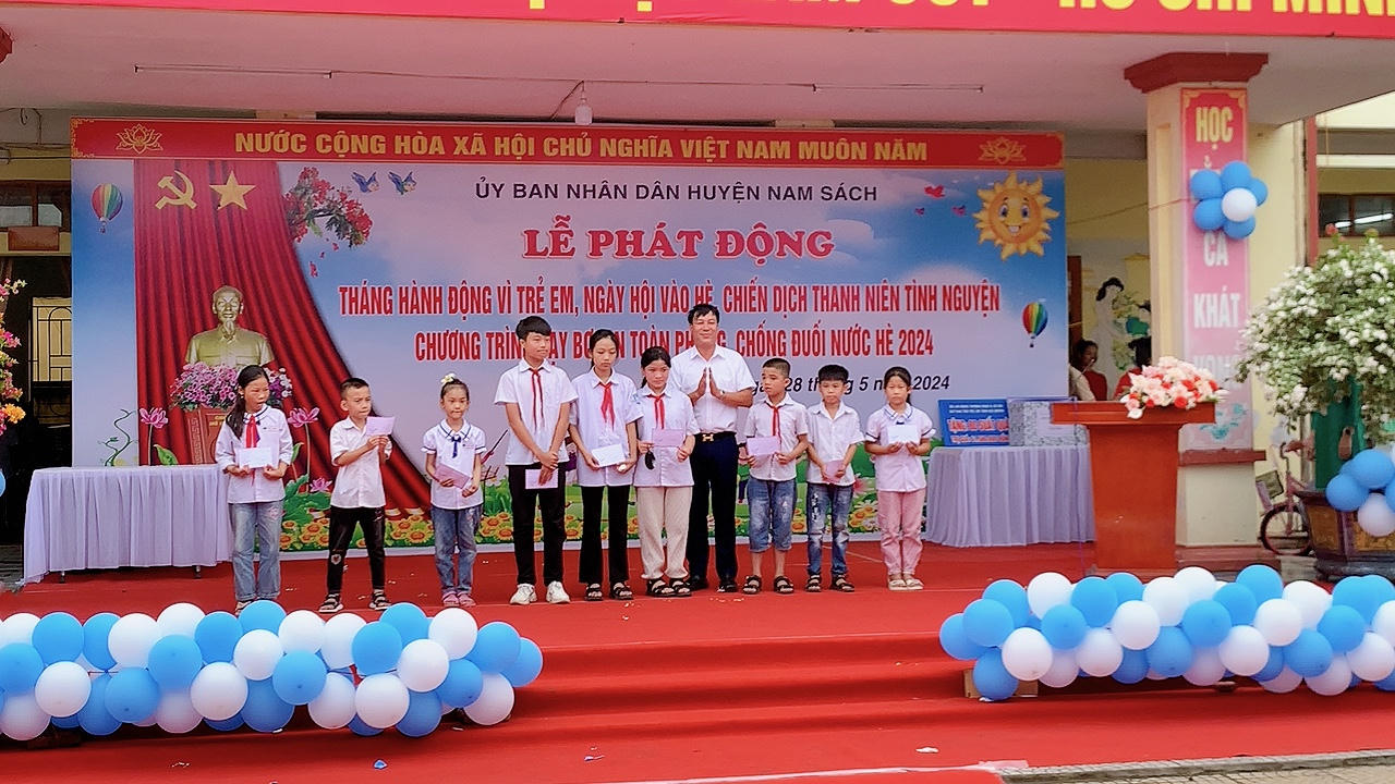 (PLVN) - Sáng 28/5, UBND huyện Nam Sách (Hải Dương) tổ chức Lễ phát động tháng hành động vì trẻ em, ngày hội vào hè, chiến dịch thanh niên tình nguyện… tại Trường Tiểu học và Trung học Cơ sở Hồng Phong nhằm đẩy mạnh phong trào toàn dân chăm sóc, giáo dục và bảo vệ trẻ em, tạo điều kiện và cơ hội để trẻ sống, phát triển trong môi trường lành mạnh, an toàn, phát triển toàn diện.