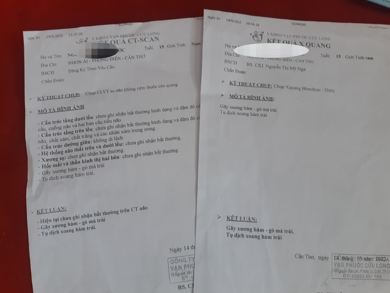 Gia đình P. đưa em đến Bệnh viện đa khoa huyện Phong Điền thăm khám và nơi đây yêu cầu chuyển tuyến trên. Theo kết quả chụp CT-Scan của Phòng khám đa khoa Vạn Phước Cửu Long (quận Ninh Kiều, TP Cần Thơ), P. bị gãy xương hàm - gò má trái, tụ dịch xoang hàm trái.