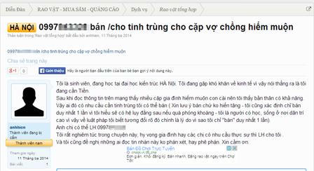 Một nam sinh rao trên mạng: "Tôi là sinh viên, đang học tại Đại học Kiến trúc Hà Nội. Tôi đang gặp khó khăn về kinh tế vì vậy nói thẳng ra là tôi đang cần tiền. Sau khi đọc thông tin trên mạng thấy có nhiều cặp gia đình hiếm muộn con cái nên tôi thấy bản thân có khả năng. Vậy ai có nhu cầu cần tinh trùng tôi có thể bán (Xin lưu ý là bán chứ không hiến tặng - tôi cũng xác định chỉ bán duy nhất một lần... Anh chị có thể liên hệ: 09978xxxxx".
