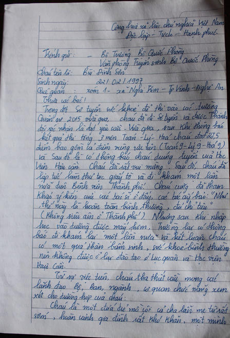 Em đã viết một bức thư gửi Bộ trưởng Bộ Quốc phòng trình bày về những nguyện vọng và hoàn cảnh gia đình em. Gia đình và bản thân em cũng viết một bản cam kết sẽ chịu hoàn toàn trách nhiệm nếu quá trình học xảy ra điều gì đó về sức khỏe. Nhưng em tin, sức khỏe em hoàn toàn khỏe mạnh và đủ sức để theo học”, Sơn cho biết.
