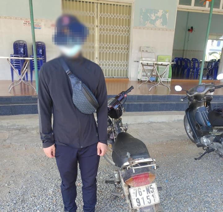 Đối tượng Nguyễn Lưu Tuấn Vũ cùng chiếc xe máy trộm trên đường né chốt kiểm soát y tế. |