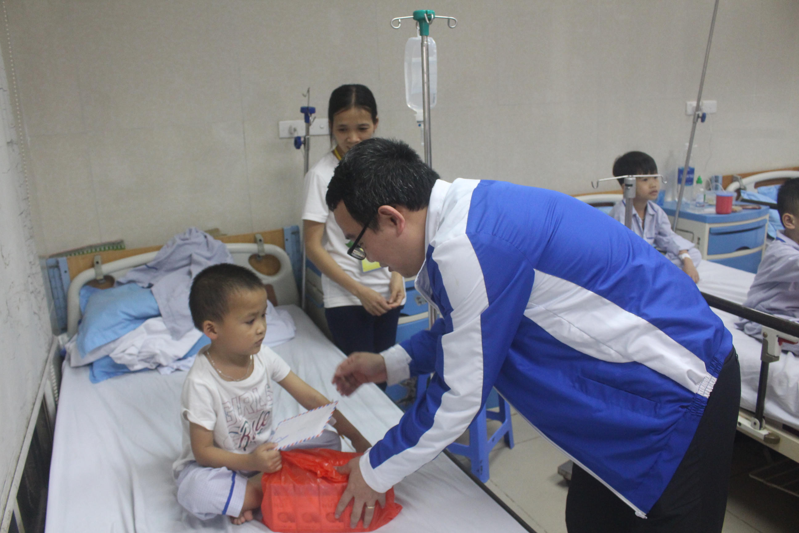 Đồng chí Hồ Quang Huy, Ủy viên Ban Chấp hành Đoàn Khối, Bí thư Đoàn Bộ Tư pháp thăm, tặng quà các cháu thiếu nhi bị bệnh máu tại Viện Huyết học truyền máu Trung ương năm 2019. |