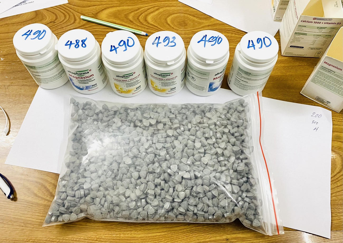 Khám xét khẩn cấp các hộp nhựa trên, tổ công tác phát hiện bên trong có 2.941 viên nén màu xám không rõ hình dạng.