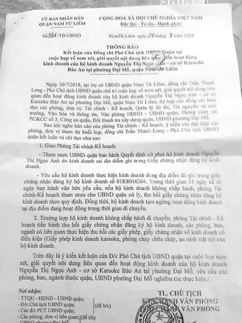 Được biết, ngày 21/8/2018, UBND quận Nam Từ Liêm đã ban hành Văn bản số 551/TB-UBND thông báo kết luận của ông Trần Thanh Long - Phó Chủ tịch UBND quận về việc xem xét nội dung liên quan đến hoạt động kinh doanh của hộ kinh doanh Nguyễn Thị Ngọc Anh. Theo thông báo này, lãnh đạo UBND quận giao Phòng Tài chính - Kế hoạch tham mưu cho UBND quận ban hành quyết định xử phạt hộ kinh doanh Nguyễn Thị Ngọc Anh (cơ sở karaoke Bảo An) do kinh doanh sai địa điểm ghi trong giấy chứng nhận đăng ký kinh doanh. Yêu cầu hộ kinh doanh thực hiện kinh doanh đúng địa điểm đã ghi trong giấy chứng nhận đăng ký hộ kinh doanh. Trong thời gian 15 ngày kể từ ngày ban hành văn bản yêu cầu, nếu hộ kinh doanh không chấp hành, sẽ bị thu hồi giấy chứng nhận đăng ký kinh doanh theo quy định, đồng thời hộ kinh doanh tạm ngừng hoạt động kinh doanh tại địa điểm trong thời gian di chuyển.