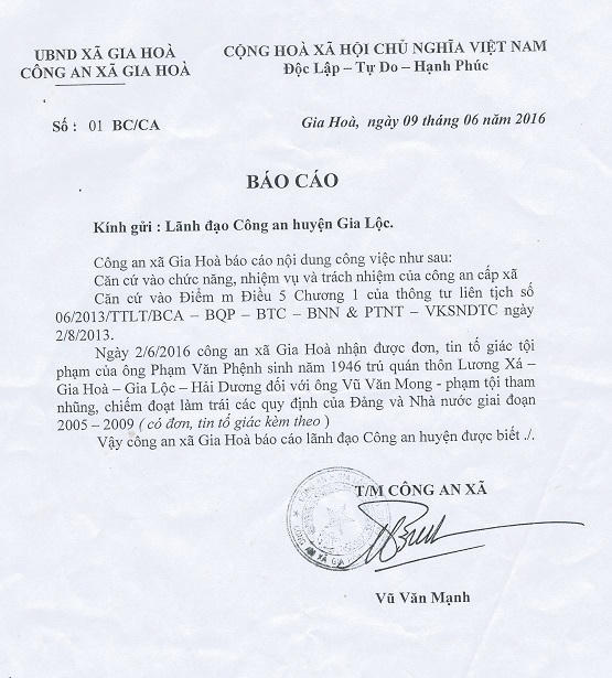 Theo tố cáo của ông Phệnh, ban lãnh đạo xã Gia Hòa giai đoạn 2005 -2009 do ông Vũ Văn Mong làm chủ tịch đã có nhiều sai phạm trong việc quản lý kinh tế, có dấu hiệu trục lợi. Nội dung tố cáo này ông đã nêu trong các đơn gửi UBND huyện Gia Lộc và Công an huyện Gia Lộc từ những năm 2009-2010. Mặc dù đơn được giải quyết, những nội dung tố cáo cũng được xác định là có cơ sở, nhưng việc xử lý trách nhiệm của những người làm sai thì vẫn chỉ là "giơ cao đánh khẽ".
