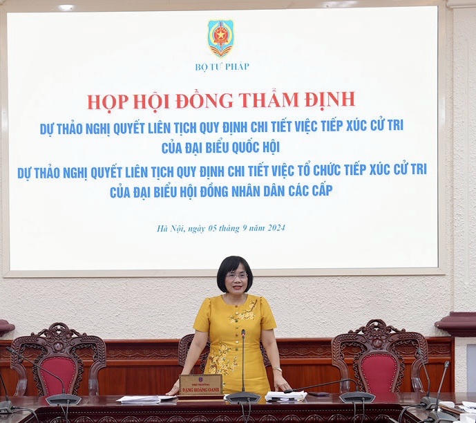 Phát biểu kết luận buổi thẩm định, Thứ trưởng Đặng Hoàng Oanh đánh giá cao sự nghiên cứu, chuẩn bị Dự thảo 2 Nghị quyết, đồng thời nhất trí về sự cần thiết và phù hợp với chủ trương, đường lối của Đảng của 2 Nghị quyết liên tịch quy định chi tiết việc tiếp xúc cử tri của đại biểu Quốc hội và của đại biểu HĐND các cấp. Tuy nhiên, Thứ trưởng đề nghị cơ quan chủ trì soạn thảo bổ sung căn cứ pháp lý để xây dựng 2 Nghị quyết như Luật Hiến pháp, Luật Hoạt động giám sát của Quốc hội và HĐND, Luật Ban hành văn bản quy phạm pháp luật…