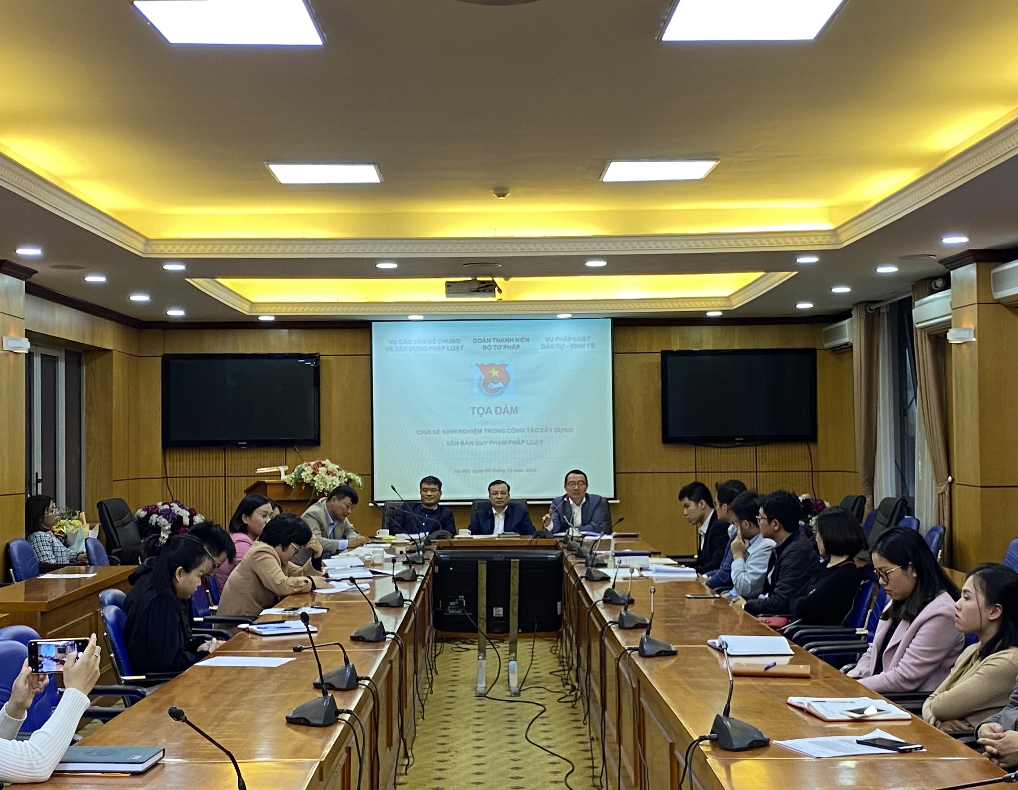 Tại Tọa đàm, các đại biểu đã chia sẻ kinh nghiệm, trao đổi, thảo luận về những khó khăn vướng mắc trong quá trình phối hợp giữa các cá nhân, các đơn vị… trong công tác xây dựng văn bản quy phạm pháp luật, từ đó rút ra bài học kinh nghiệm, góp phần xây dựng phát triển hơn công tác, nghề nghiệp cho các đoàn viên thanh niên về các vấn đề như thực trạng và giải pháp nâng cao chất lượng công tác góp ý, thẩm định đề nghị, dự thảo văn bản quy phạm pháp luật trong lĩnh vực dân sự - kinh tế; một số khó khăn, vướng mắc và đề xuất, kiến nghị về công tác thẩm định đề nghị xây dựng và dự án, dự thảo văn bản quy phạm pháp luật về hình sự, hành chính; khó khăn, vướng mắc trong công tác xây dựng văn quy phạm pháp luật và một số đề xuất, kiến nghị…