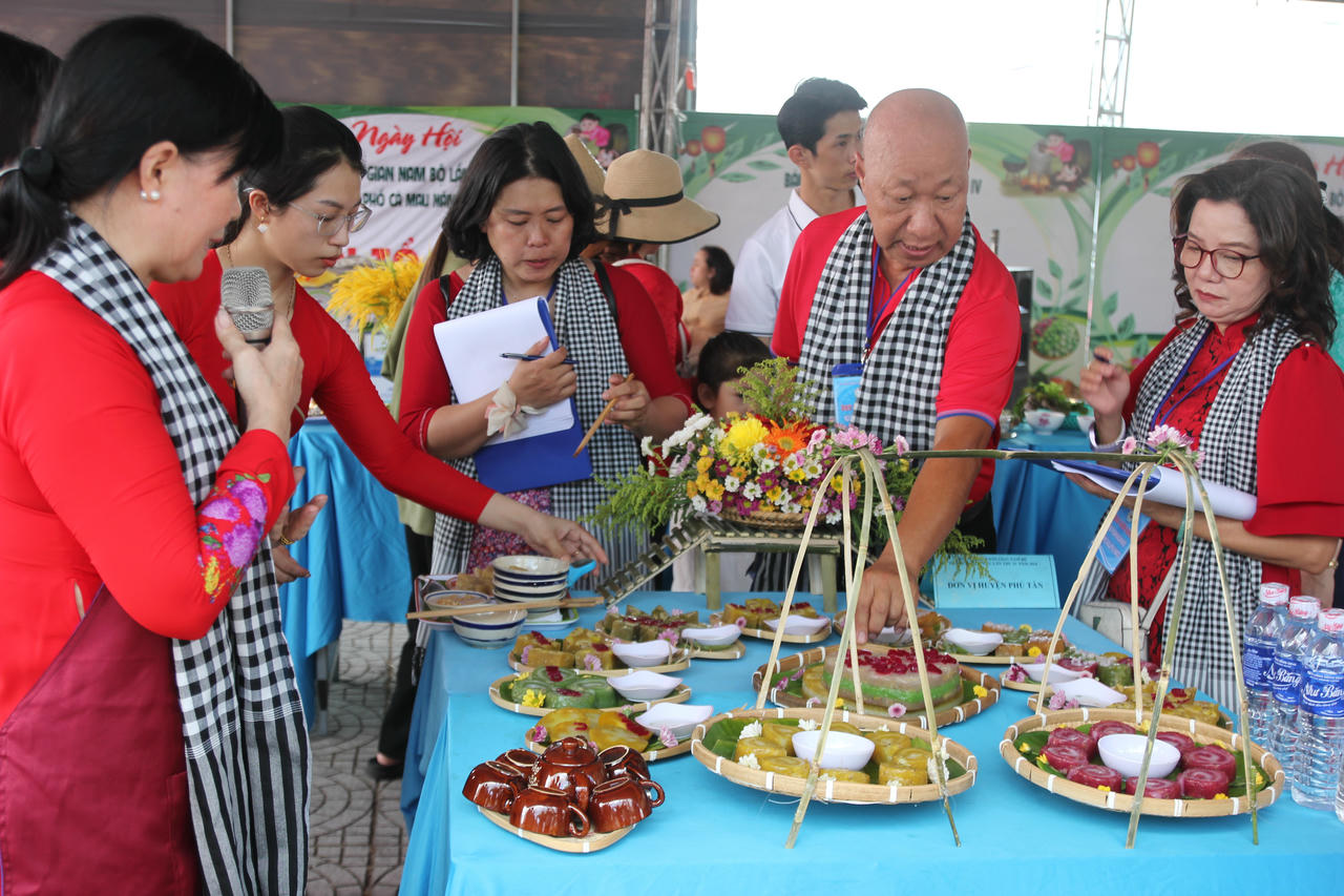 Ban Giám khảo chấm điểm và nghe thuyết trình của đơn vị Hội LHPN huyện Phú Tân về phần thi bánh dân gian của đơn vị mình. |