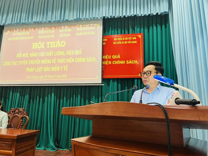 Phát biểu tham luận tại hội thảo, ông Võ Khánh Bình - Giám đốc BHXH tỉnh Tiền Giang đã nêu kết quả việc tổ chức thực hiện chính sách BHYT trong thời gian qua và những giải pháp cụ thể cho từng nhóm người tham gia BHYT, nhằm quyết tâm duy trì và giữ vững tỷ lệ bao phủ BHYT được Tỉnh ủy, UBND và HĐND giao Ngành BHXH trong năm 2023. Từ đó, giúp cho các đại biểu tham dự nắm rõ hơn về vai trò, trách nhiệm của đơn vị trong công tác phối hợp vận động, tuyên truyền người dân tham gia BHYT.