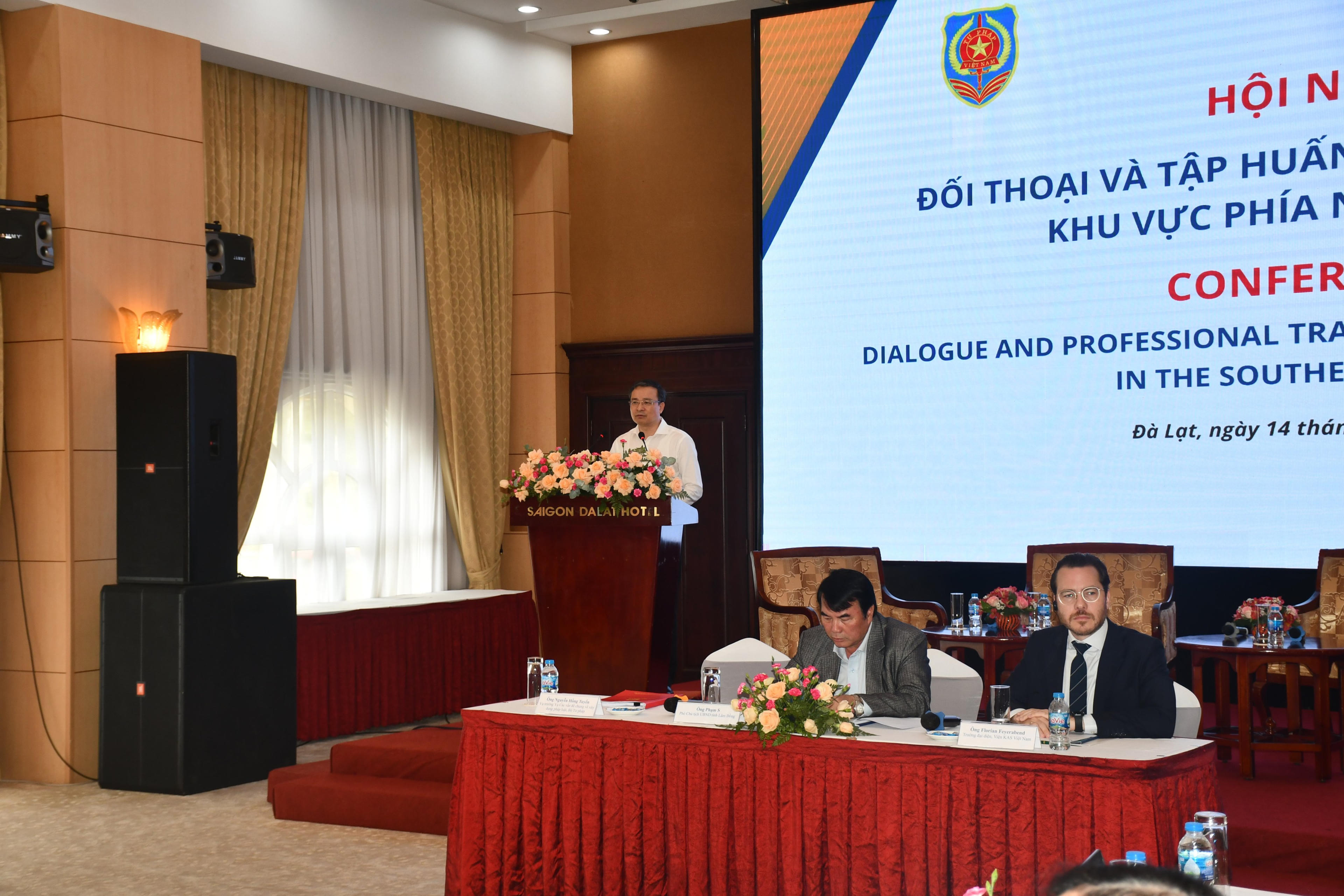 Ông Nguyễn Hồng Tuyến, Vụ trưởng Vụ Các vấn đề chung về xây dựng pháp luật (Bộ Tư pháp); ông Phạm S, Phó Chủ tịch UBND tỉnh Lâm Đồng; ông Florian Feyerabend, Trưởng đại diện Văn phòng Viện KAS tại Việt Nam đồng chủ trì hội nghị.