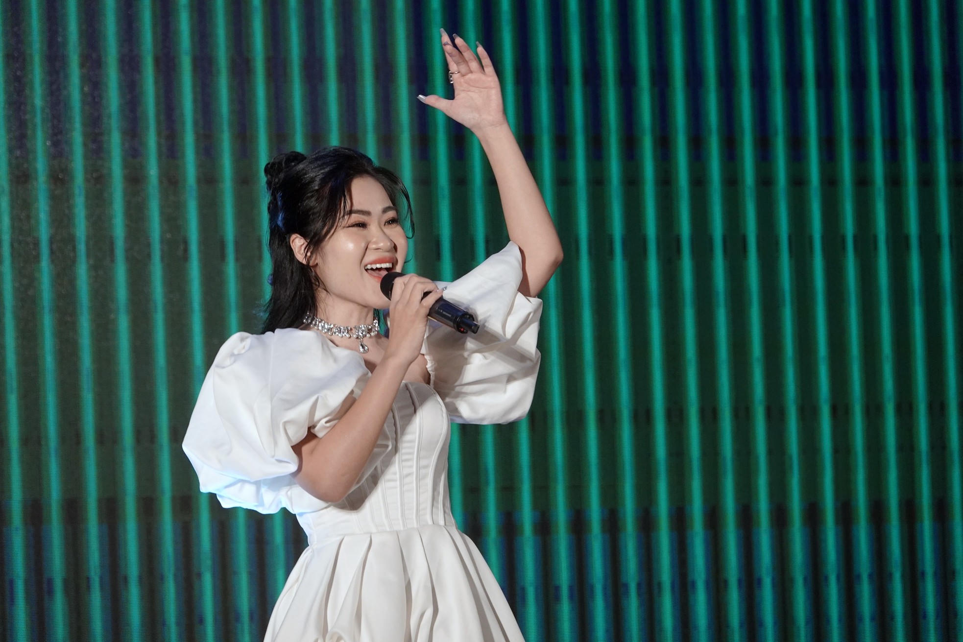Ca sĩ Hà Myo - Gương mặt trẻ Việt Nam tiêu biểu năm 2022 biểu diễn tại Lễ tốt nghiệp Lớp bồi dưỡng kiến thức quốc phòng và an ninh đối tượng 2 - Khóa 121. |