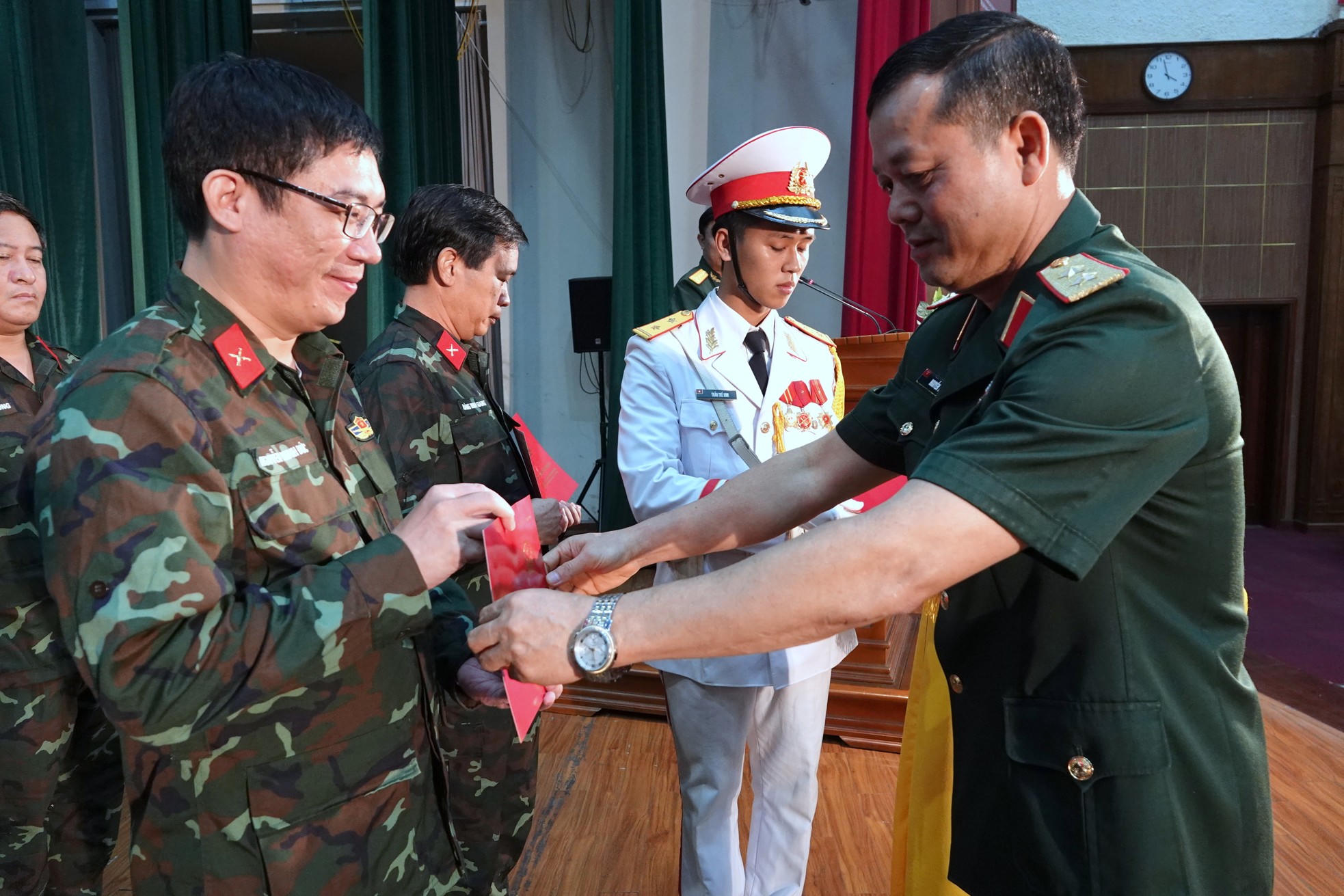 Trung tướng, PGS.TS Nguyễn Văn Bạo - Giám đốc Học viện Chính trị, trao chứng nhận tốt nghiệp cho các học viên Lớp bồi dưỡng kiến thức quốc phòng và an ninh đối tượng 2 - Khóa 121. |