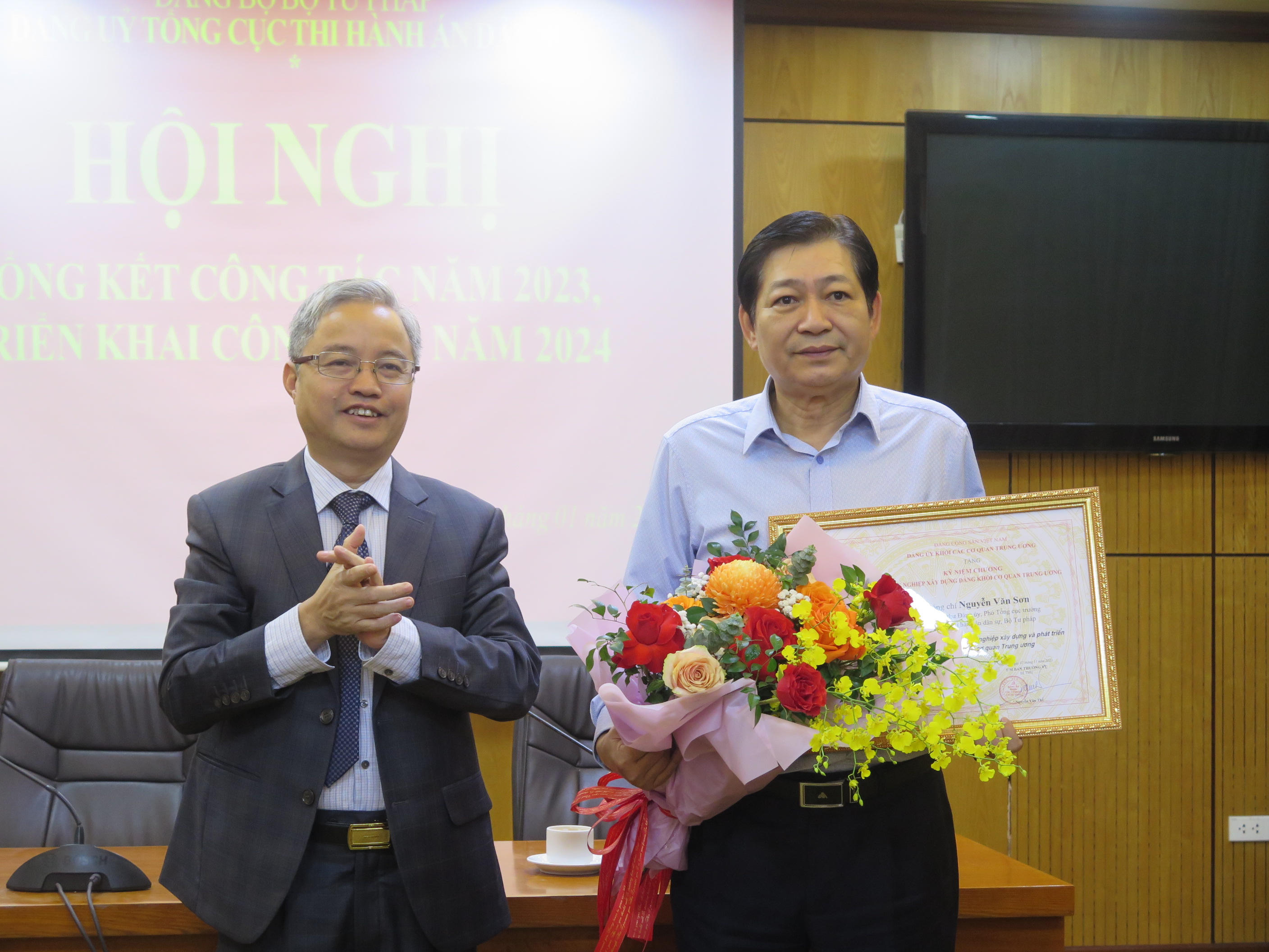 Ủy viên Ban thường vụ Đảng ủy Bộ Tư pháp, Bí thư Đảng ủy Tổng cục THADS, Tổng cục trưởng Tổng cục THADS Nguyễn Quang Thái trao Kỷ niệm chương trong công tác xây dựng Đảng cho ông Nguyễn Văn Sơn. |
