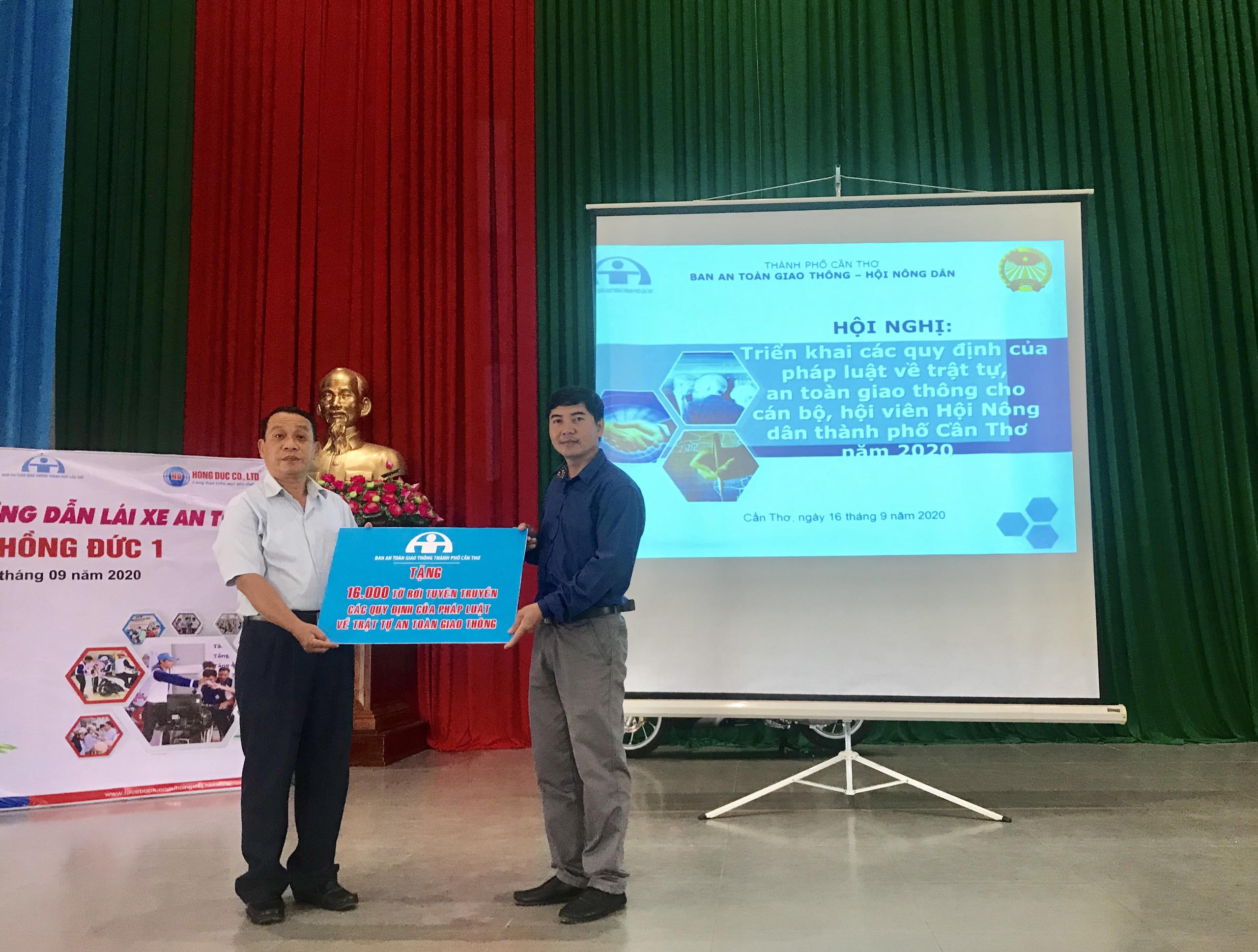 Ông Lê Hoàng Cẩn, Phó Chánh Văn phòng Ban ATGT TP (bên phải) trao tặng 16.000 tờ rơi tuyên truyền cho Hội nông dân TP Cần Thơ. |