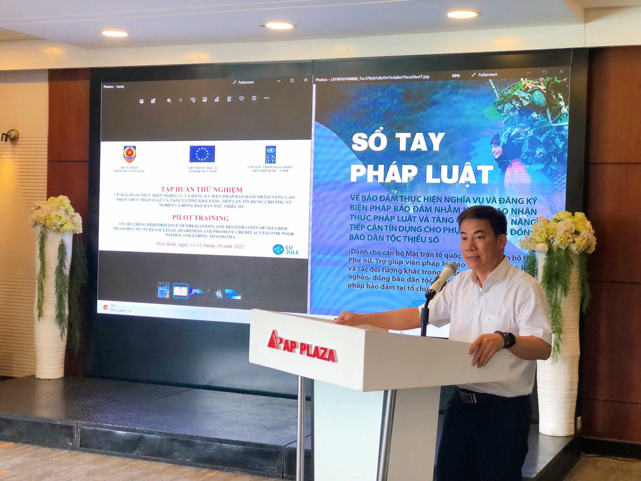 (PLVN) -Trong 02 ngày từ 11-12/10/2022, tại tỉnh Hòa Bình, Cục Đăng ký quốc gia giao dịch bảo đảm đã tổ chức Lớp tập huấn thử nghiệm hướng dẫn sử dụng Sổ tay pháp luật về bảo đảm thực hiện nghĩa vụ và đăng ký biện pháp bảo đảm nhằm nâng cao nhận thức pháp luật và tăng cường khả năng tiếp cận tín dụng cho phụ nữ nghèo và đồng bào dân tộc thiểu số.