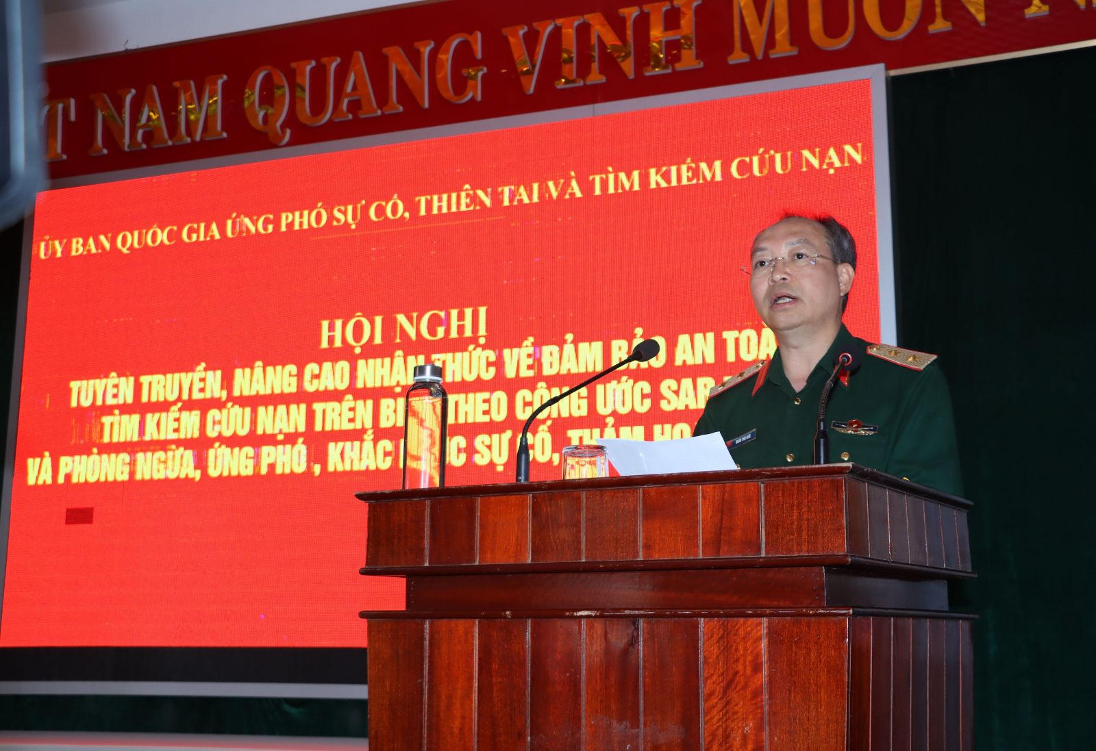 Trung tướng Doãn Thái Đức, Cục trưởng Cục Cứu hộ - Cứu nạn (Bộ Quốc phòng), Chánh Văn phòng Ủy ban Quốc gia Ứng phó sự cố thiên tai và Tìm kiếm cứu nạn phát biểu tại hội nghị. |