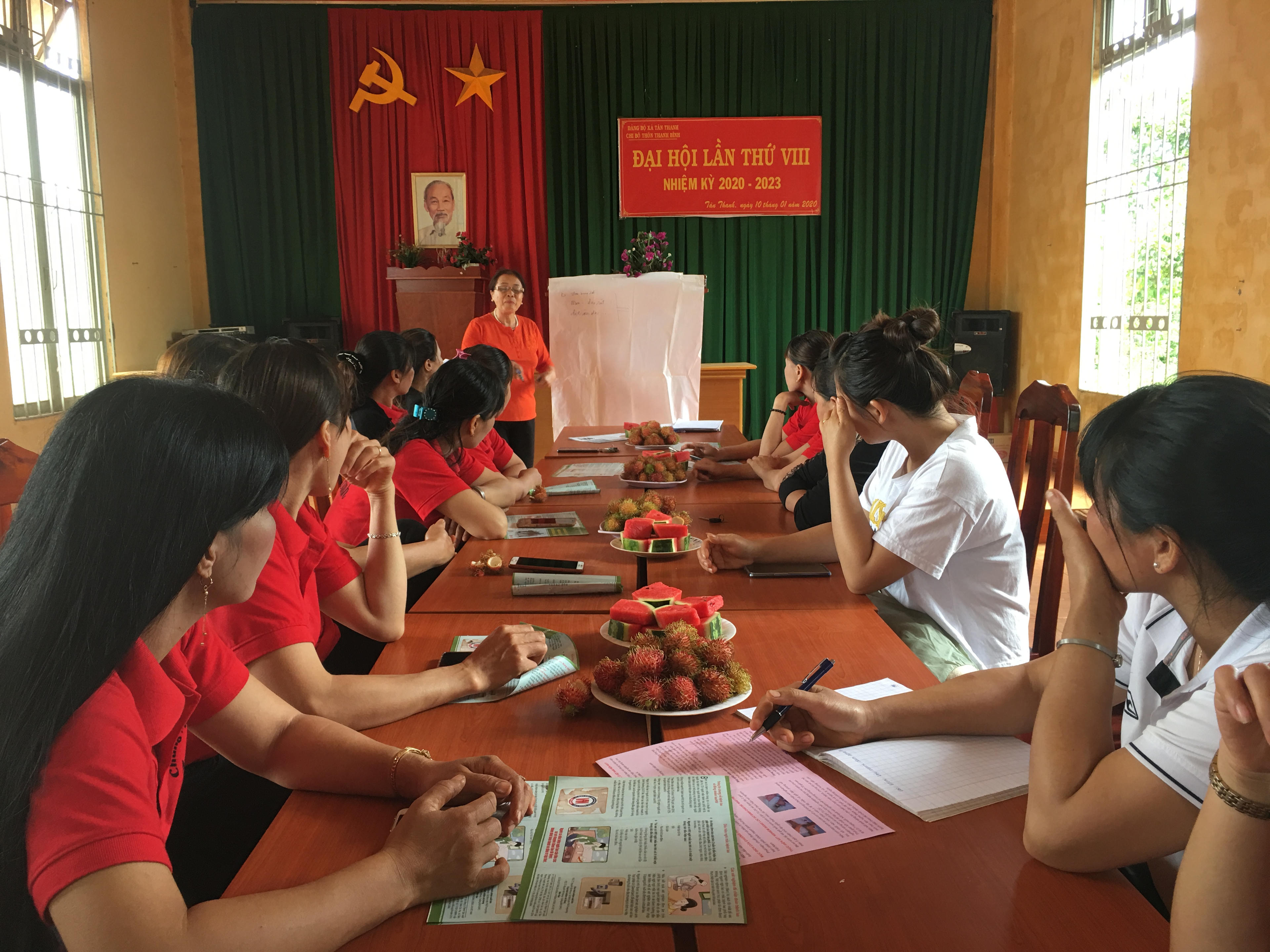 | Nhóm cộng đồng “Tự tin vào ngày mai” (thôn Thanh Bình, xã Tân Thanh, huyện Lâm Hà, tỉnh Lâm Đồng) phổ biến kiến thức về SKSS cho chị em phụ nữ định kỳ hàng tháng. |