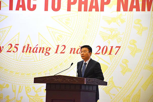 Thứ trưởng Phan Chí Hiếu đã báo cáo tóm tắt tổng kết công tác tư pháp năm 2017 và phương hướng, nhiệm vụ, giải pháp công tác năm 2018. Theo đó, công tác chỉ đạo, điều hành của bộ, ngành, địa phương đối với công tác tư pháp, pháp chế tiếp tục bám sát mục tiêu phát triển kinh tế -xã hội của Đảng, Quốc hội, Chính phủ và từng địa phương với quyết tâm đổi mới theo phương thức lãnh đạo, chỉ đạo, điều hành của Chính phủ về xây dựng Chính phủ kiến tạo, liêm chính và phục vụ nhân dân. Các mặt công tác cụ thể từ xây dựng, thẩm định, kiểm tra, rà soát, hệ thống văn bản quy phạm pháp luật và pháp điển hệ thống quy phạm pháp luật; thi hành án dân sự đến phổ biến, giáo dục pháp luật, hòa giải ở cơ sở, quản lý xử lý vi phạm hành chính và theo dõi thi hành pháp luật… đều đạt kết quả tích cực.