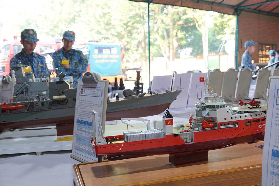 Mô hình tàu cứu nạn tàu ngầm đa năng 927-Yết Kiêu và tàu chiến đấu của Quân chủng Hải quân. |